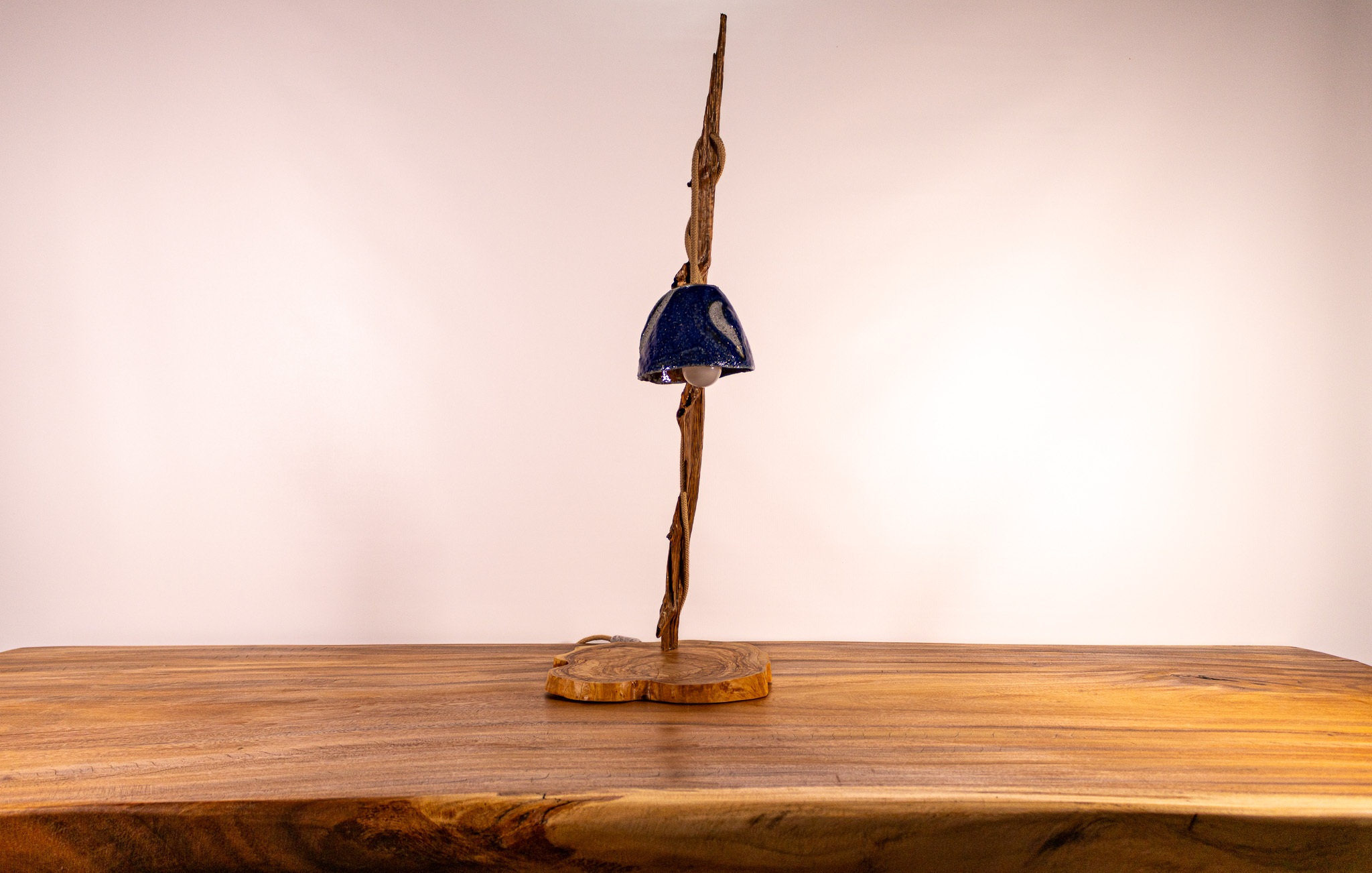 Autres détails : Socle en olivier, racine de sabine aux formes délicates et céramique bleue : une lampe sculpturale qui diffuse une lumière douce, comme une note suspendue.
