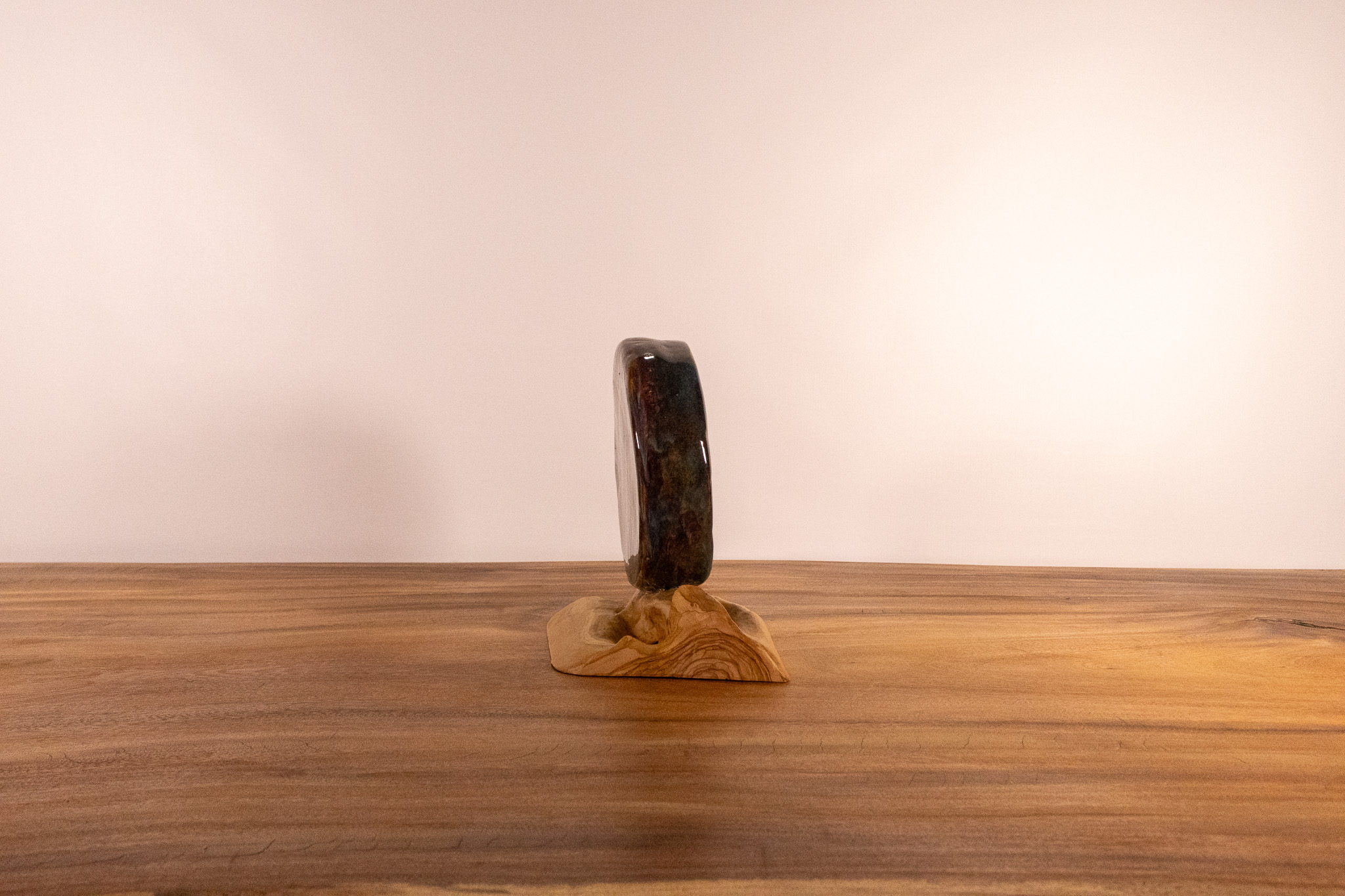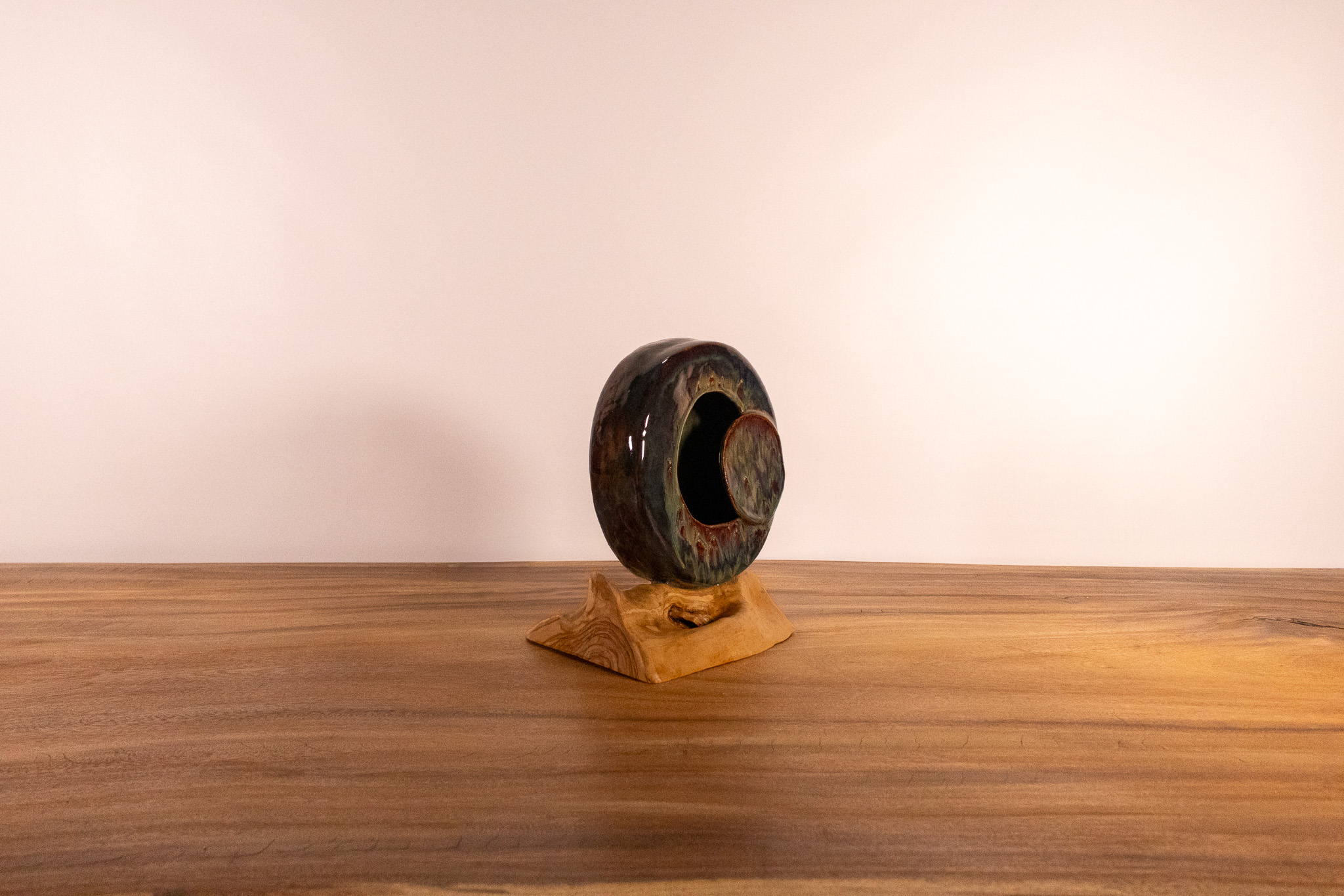 Matériaux : Olivier et céramique gris clair aux reflets bleus et rouille