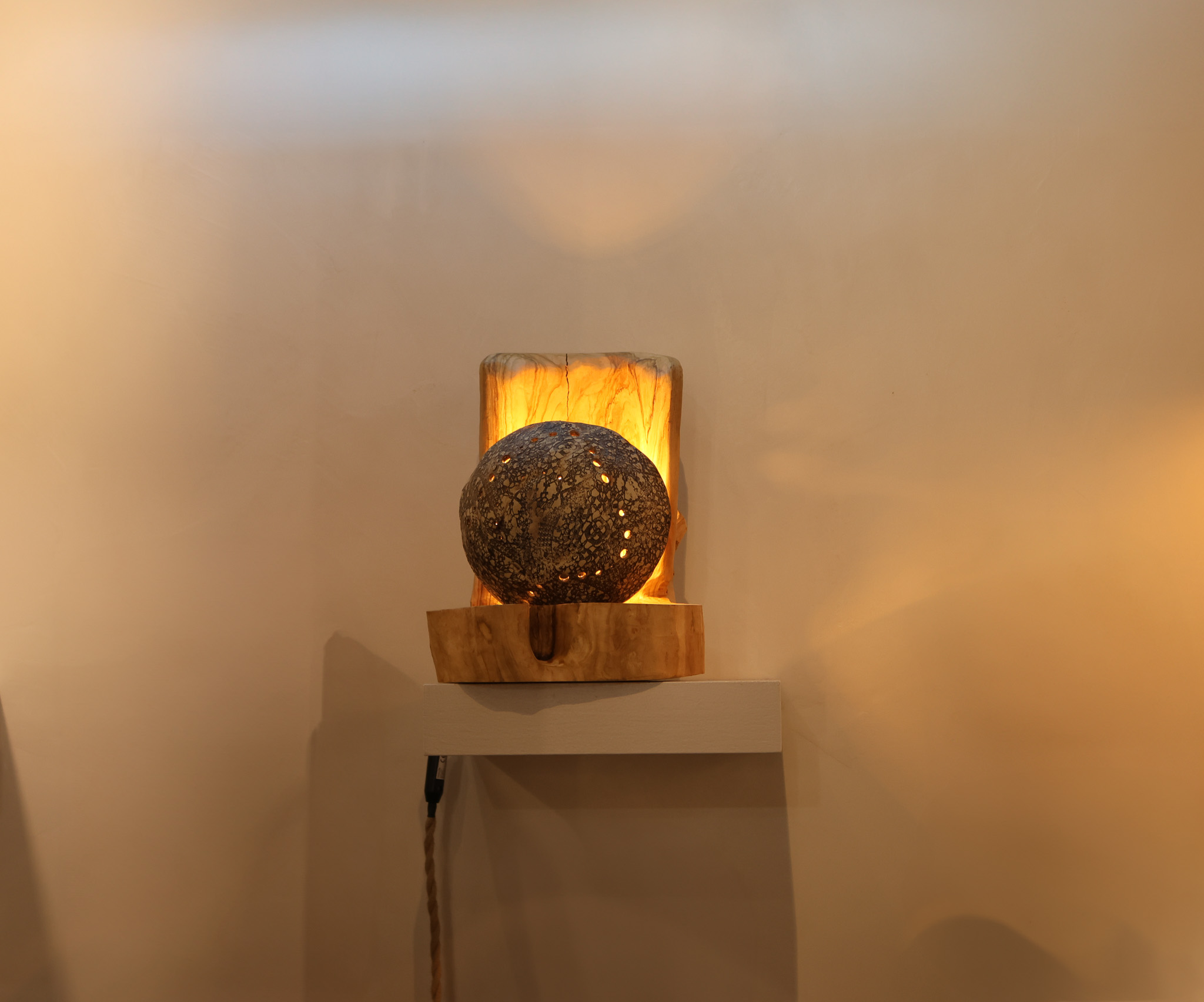 Autres détails : Socle en olivier et céramique dentelée : une lampe qui révèle une lumière intime et mystérieuse.