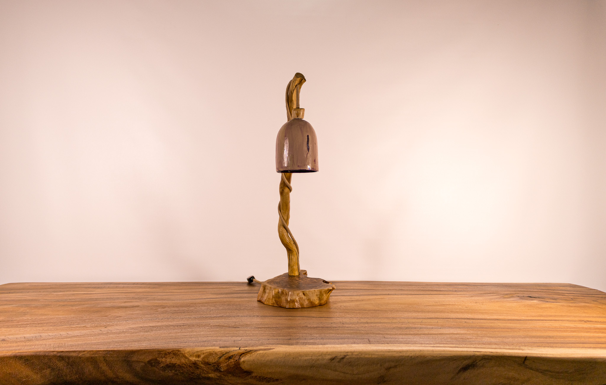 Autres détails : Olivier, pin et céramique violet : une lampe au design fluide qui diffuse une lumière douce et raffinée.