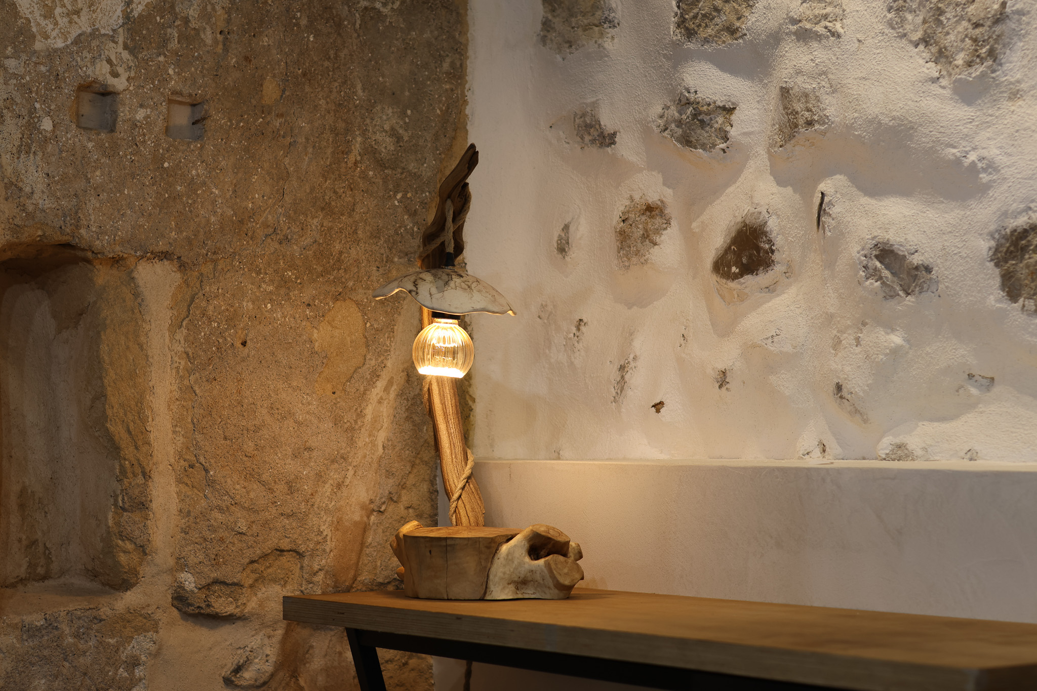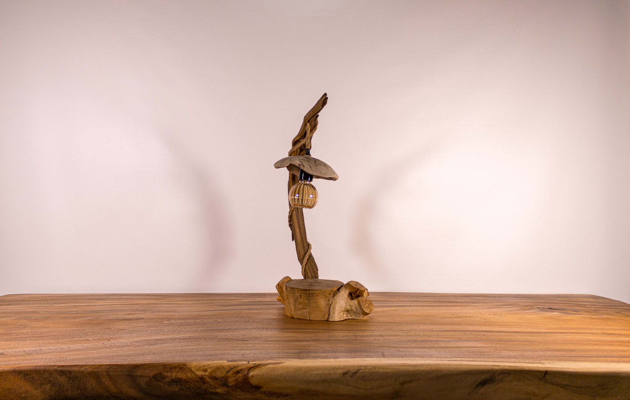 Autres détails : Olivier, bois flotté et Raku : une lampe organique où la lumière s'épanouit comme une fleur.