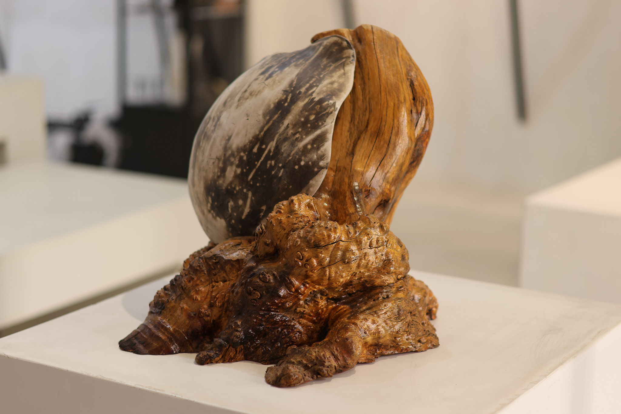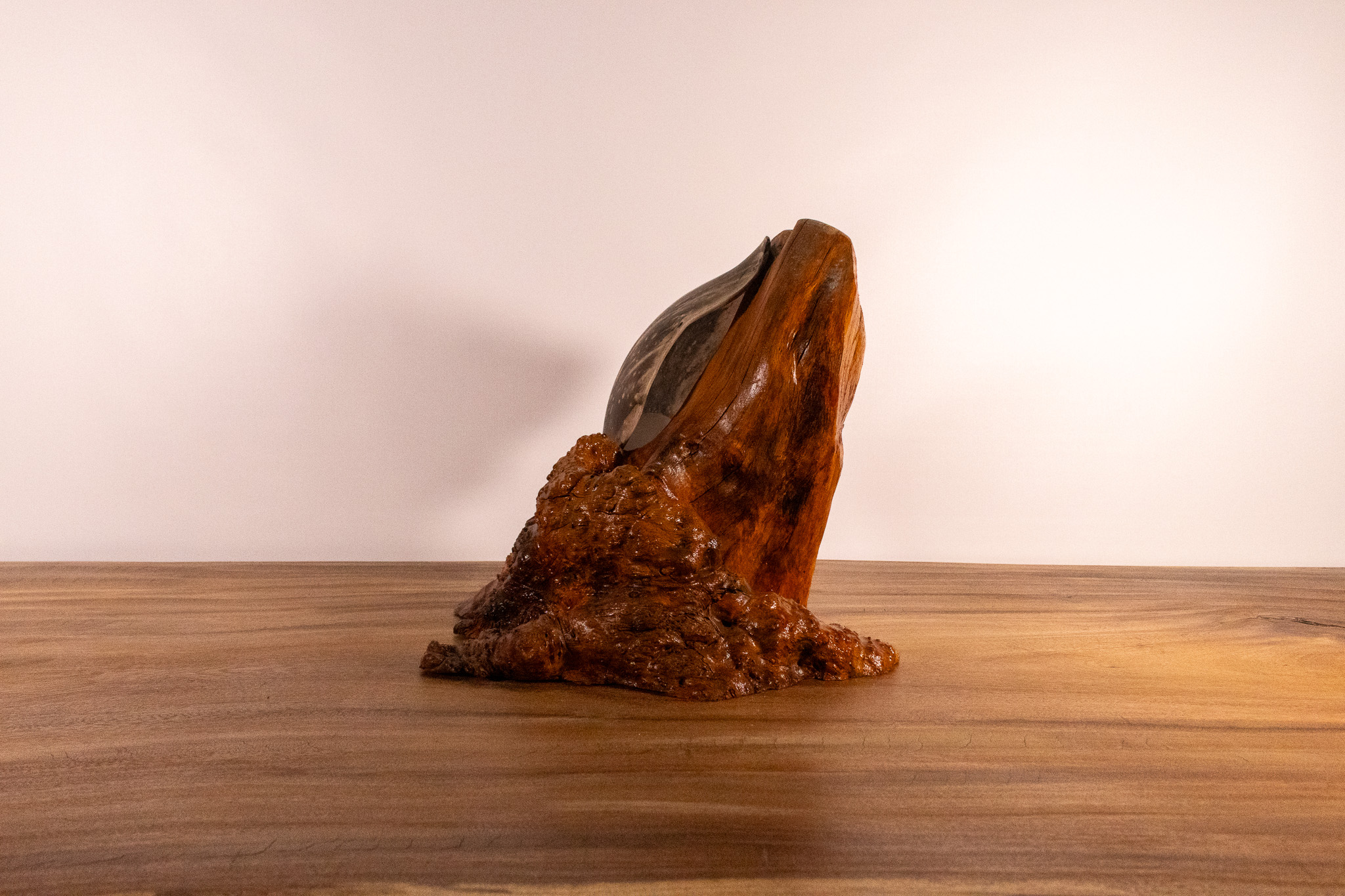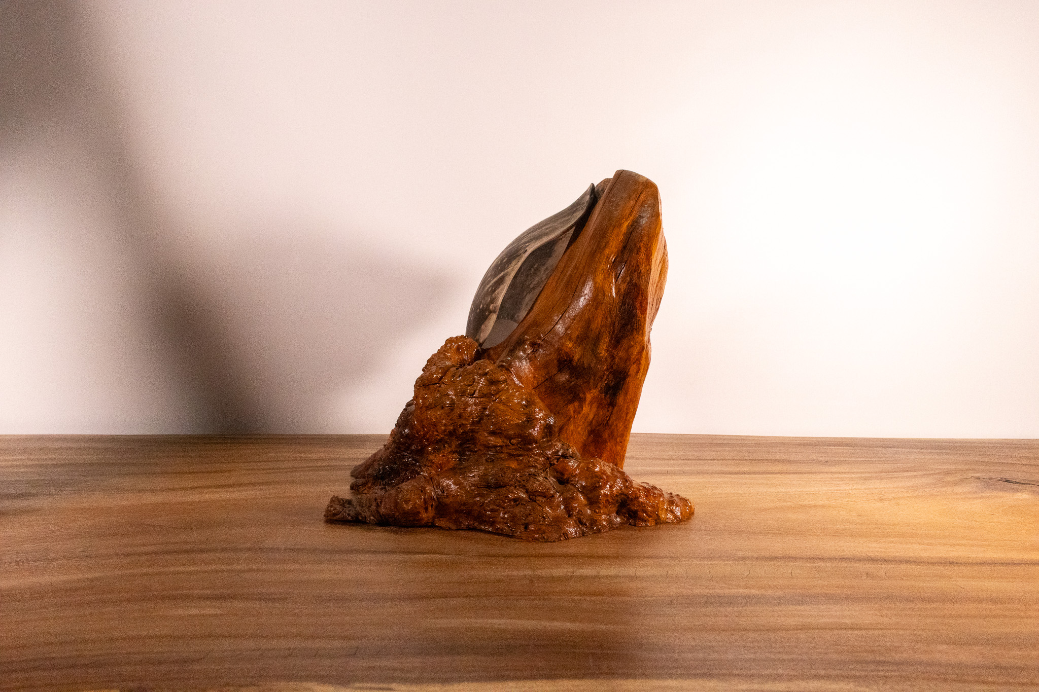 Autres détails : Racine d'amandier et Raku brut : une lampe sculpturale qui évoque la beauté naturelle des rivages.